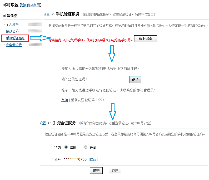 1)登录时提供手机短信验证功能:在Webmail“设置”处,新增“手机验证服务”的设置,进一步提升安全性。在此完成手机号码绑定,则在下次登录Webmail输入正确的邮箱密码后,系统将自动发送一条6位数的动态密码至所绑定的手机,输入此密码方可成功登录。设置步骤见下图。