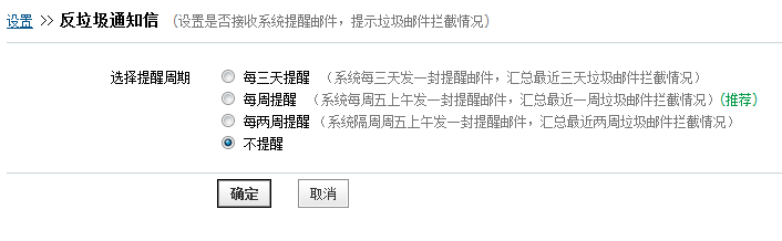 2)反垃圾通知信功能:在Webmail“设置”处,新增“反垃圾通知信”的设置,如果选择开启此设置,则将定期收到垃圾邮件拦截情况的系统通知邮件。